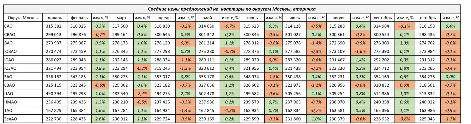 1. Средняя цена предложения 1 кв. м московской недвижимости на вторичном рынке на 31 октября 2024 года составила 294 874 рублей (-0,51%). Лидером роста стал САО +0,4%, снизились цены в ЗелАо -1,7%.